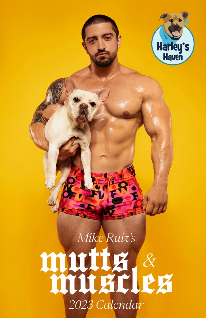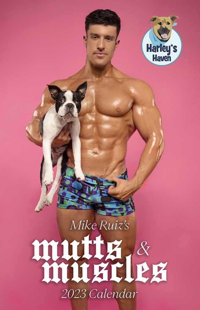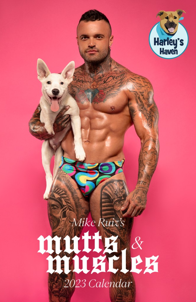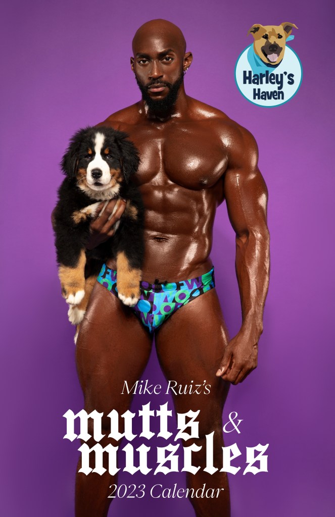 Winnie McCroy: We’re here with celebrity photographer Mike Ruiz to discuss his 2023 calendar, Mutts and Muscles, to raise funds for Harley’s Haven Dog Rescue. This 16-month calendar features precious pups held by some of the country’s biggest male fitness models, which is a winning combination. Tell folks a little bit about this.