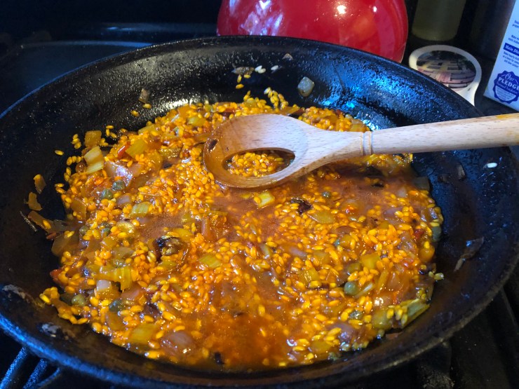Use a wooden spoon to stir your risotto (I use this special risotto spoon with a hole in the middle, so it doesn’t break the grains of rice as they cook). Whenever the liquid boils away, it’s time to add another ½ cup of stock and stir it well. Repeat this process until the entire box of stock is used up. Taste your risotto to make sure it’s tender. Add the peas and capers at the very end, then gently stir in a teaspoon of ground saffron, and/or some threads of fresh saffron, more pricey than gold.