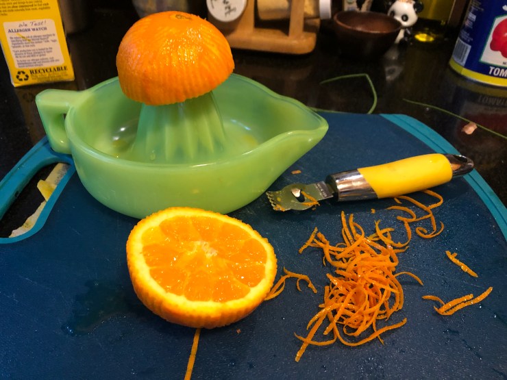 Squeeze the leftover orange membranes and whatever’s left inside the rind to get a nice separate bowl of fresh juice. Add to it a drizzle of olive oil, a bit of honey, and some salt and pepper to make a light dressing.