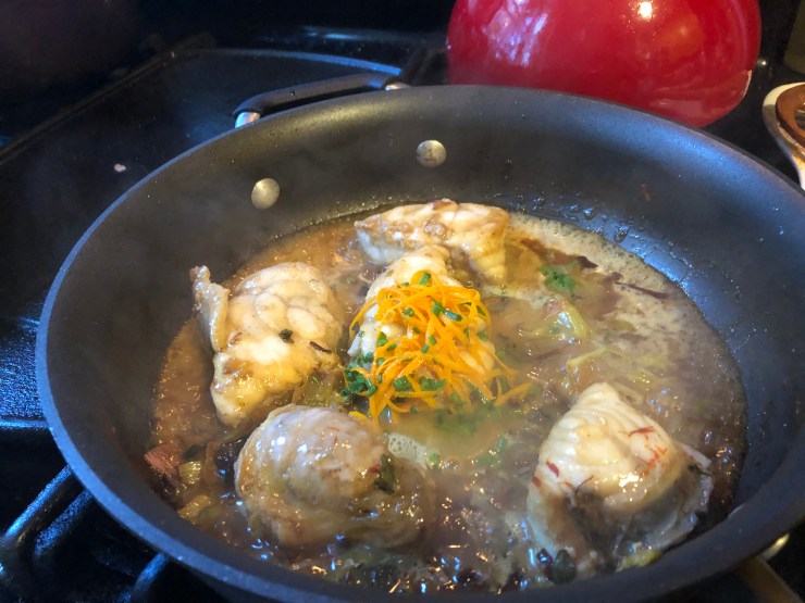 In another pan, melt a tablespoon of butter. Carefully ease your monkfish into the pan and braise it in butter. While it’s cooking, zest the peel from one orange, then cut it open and juice the inside. Turn your monkfish medallions over and cook for three more minutes, then add the herbs, orange zest and orange juice. If you like, feel free to add a few more threads of saffron. Your fish is done when you touch it and your finger doesn’t make a dent. Try not to overcook seafood!