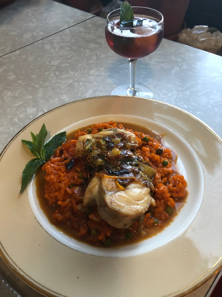 Once both the risotto and the fish are done cooking, it’s time to plate them. Put a nice portion of risotto in the center of your plate or bowl. Add a few medallions of monkfish, and sprinkle some finishing salt on the whole thing. Garnish and bring it to the table. I served mine with a Sazarac cocktail.
