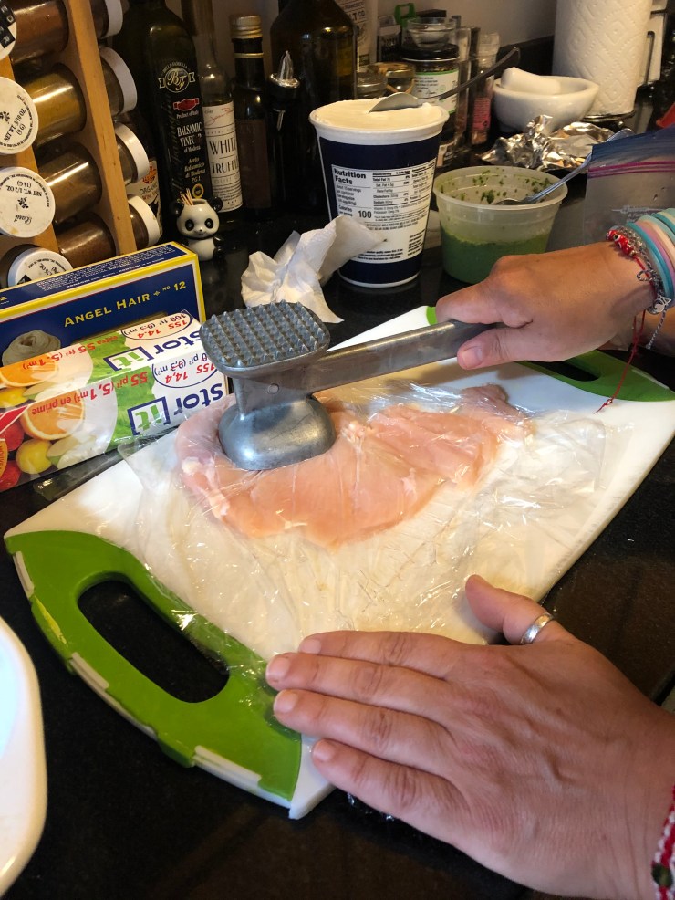 So I decided that if it was good enough for public television, it was good enough for me. I got out my chicken cutlets and my meat tenderizer, and worked out my aggression by pounding out the meat. But don’t go all psycho killer on it! What you’re trying to do is to work from the middle to the edges, thinning out the cutlet without breaking the meat. You don’t want to end up with a bunch of broken-up bits and pieces.