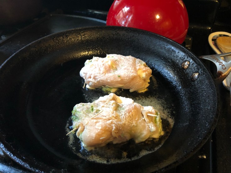 Put about a tablespoon each of your seasoned ricotta cheese (you won’t need much, so plan on making stuffed shells or something with the rest of the ricotta) and whatever pesto you’re using in the middle, then roll it up from the bottom, tucking both ends in before completing the roll. Use toothpicks to hold everything in place. Roll each chicken portion in flour and ease gently into a hot skillet. Turn once after about 4 minutes and cook the other side. Move them into an oven-safe casserole dish and be sure to remove the toothpicks. You don’t want to bite into pointy wooden pieces!