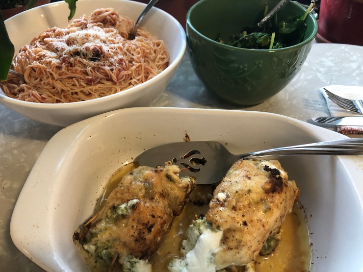 She put them into a 350 oven to finish up, and when she cut into the chicken, you could clearly see the white of the cheese contrasted with the bright green of the pesto. It looked magnificent!