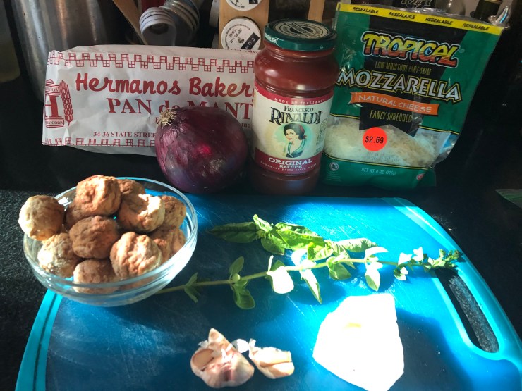 Hey gang! There’s a slight breeze in the air and I’m in the mood for something savory and spicy, but I don’t want to spend all evening in the kitchen. So today, we’ll make Meatball Subs, a quick and easy hump day recipe that you can start on the stovetop and finish in the oven (or toaster oven, if that’s how you roll.)