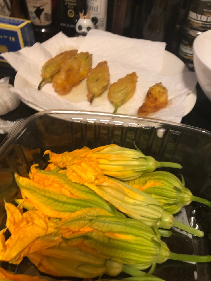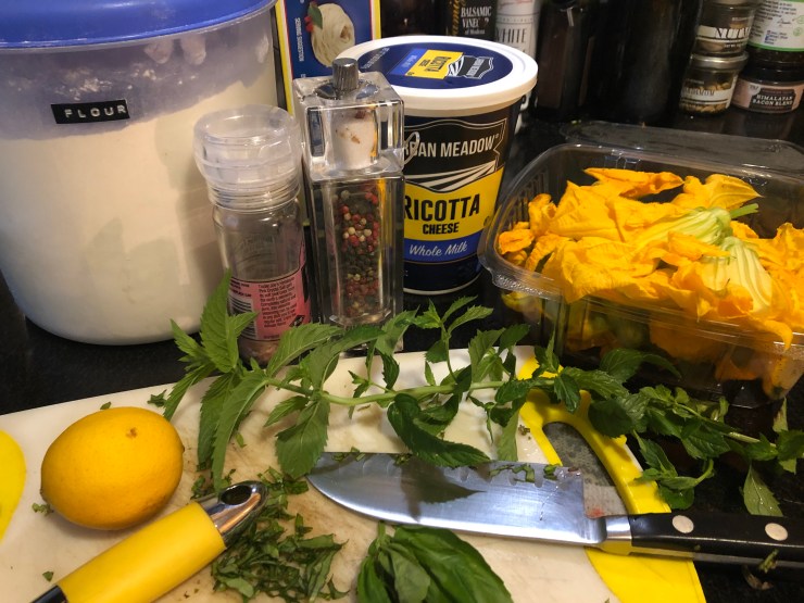 The orange blossoms come through the batter like shreds of cheese, and the mint and basil in the ricotta really pops in the most delightful way! Enjoy, but be sure not to overdo it with the blossoms or you may get heartburn. For future iterations, try stuffing them with prosciutto and mozzarella, or anchovies like real Italians like.