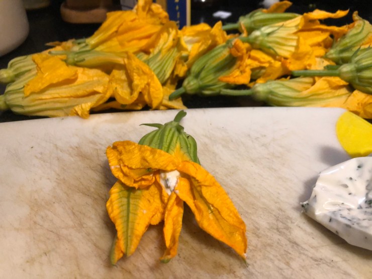 Next, mix your ricotta cheese with the chopped herbs (don’t skimp!), the lemon zest, and some salt and pepper. I put my finished mixture into a Ziploc bag and cut a small hole in the corner to fashion an ersatz piping bag. Then I used one hand to hold the blossom and blow the petals open, while piping about 1 tbsp. of ricotta into the middle. Then, twist the petals together to close the flower up and set it aside carefully.