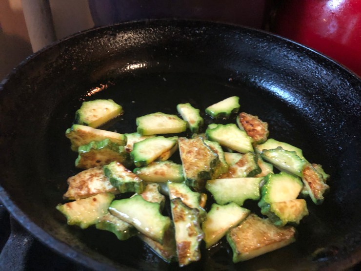 When your oil is medium-hot (don’t get it to smoking-hot), start breading your eggplant. Dip it into the egg wash and let all the egg drain off before you put it into your breadcrumbs or flour. Some people like to ‘double-dip,’ by coating the slices of eggplant in egg, then flour, then egg again, and then breadcrumbs. You do you; as for me, I don’t want all that breading.