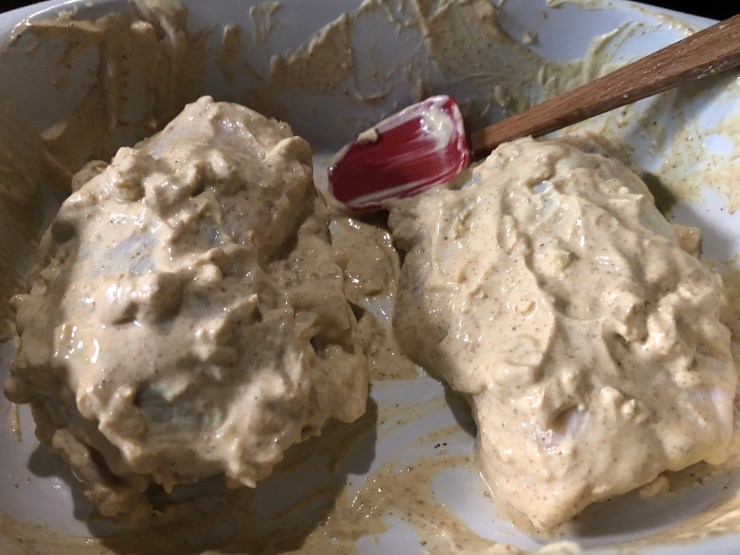 In a bowl, combine 1 cup of yogurt with 2 tbsp. diced ginger and garlic, plus one tsp. of garam masala, turmeric, cumin, chili, and salt. Marinade the chicken in it for at least 10 minutes, or ideally, overnight.