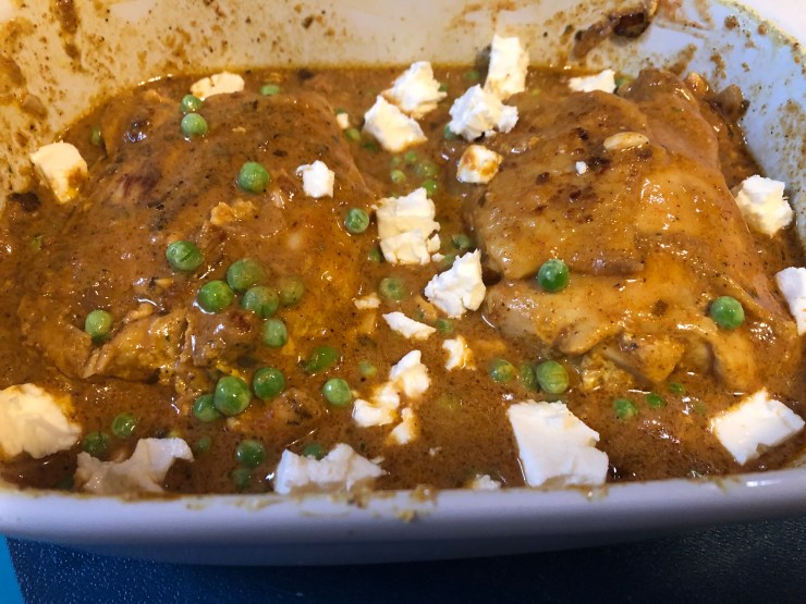 Combine the sauce and chicken in your Dutch oven, and stir together well. Add a handful of frozen peas and 1 ¼ cups of heavy cream or evaporate milk and stir again. Then, put it into a 375 degree oven for an hour to finish, until the meat is falling-apart tender.