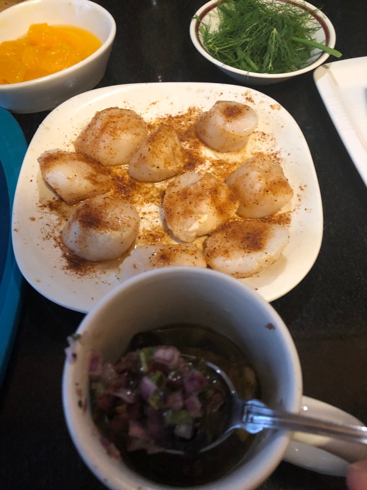 First, I got some nice frozen sea scallops out and moved them to a plate in the fridge to thaw slowly. About 3-5 large scallops per person makes a nice serving size. You should always thaw fish in the fridge, rather than leaving it out on the counter or under running water. That way it doesn’t fall to pieces. So this is me, slowly thawing two serving of scallops, then dusting them on each side with spicy Old Bay Seasoning.