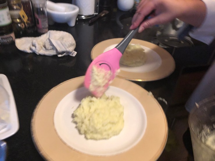 Next, get a pot of water boiling. Peel one large (or a few small) white potatoes, quarter them and put them in the pot. Then add the white bulb of the fennel, sliced into small pieces. Yes, you cook it. In a pot, with potatoes. When they’re fork-tender, drain them and run them through the food processor with 2 tbsp. of butter, 2 tsps. of salt, and a squeeze of lemon. It will look and taste like mashed potatoes when you’re done.