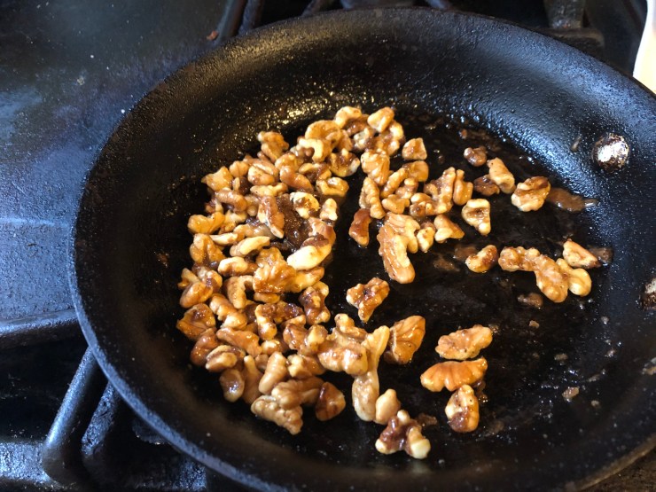 Then, I candied a handful of walnuts to toss on top. It’s easy! Put some raw walnuts in a tiny frying pan. Let them brown with a little oil—but keep a close watch, because nuts burn fast and then they’re ruined. Before these get too brown, toss in a handful of brown sugar, some salt, and a little chili powder. Shake the nuts all up in the sugar until it melts, then turn off the pan and let it cool.