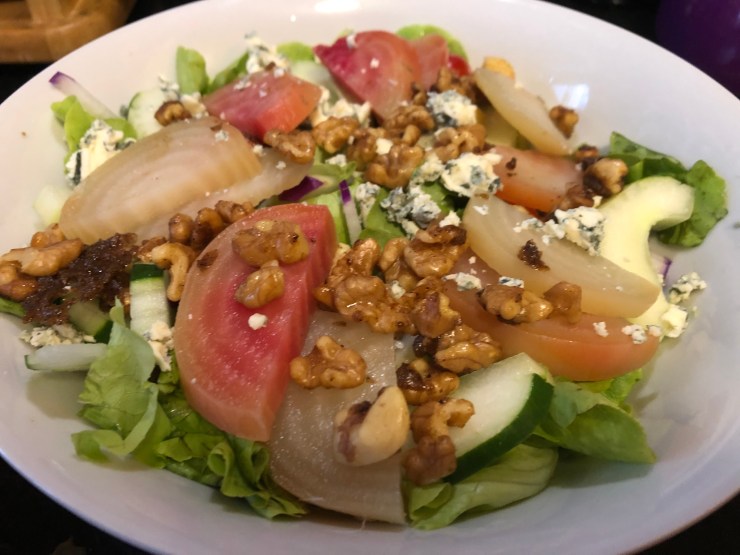 Finally, I put it all together. Lettuce topped with cukes, tomatoes, radishes, croutons, a nice fanning out of beets, a handful of candied walnuts and a glorious shaking of gorgonzola cheese. I used aged cheddar for my better half, because she doesn’t go for stinky cheese.